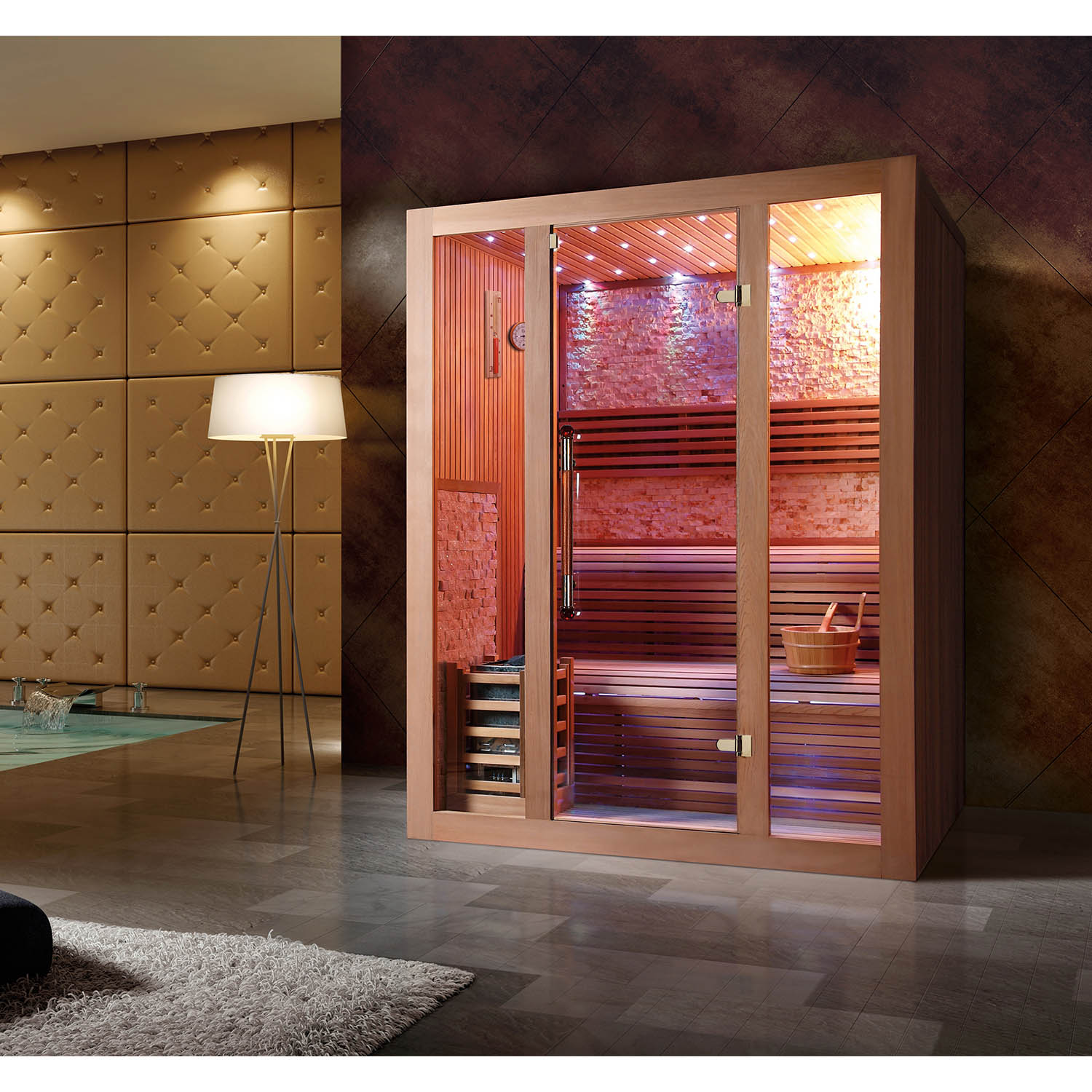Внутри сауны используется светодиодное освещение. Цвет можно изменить на красный, зеленый, синий и градиент.